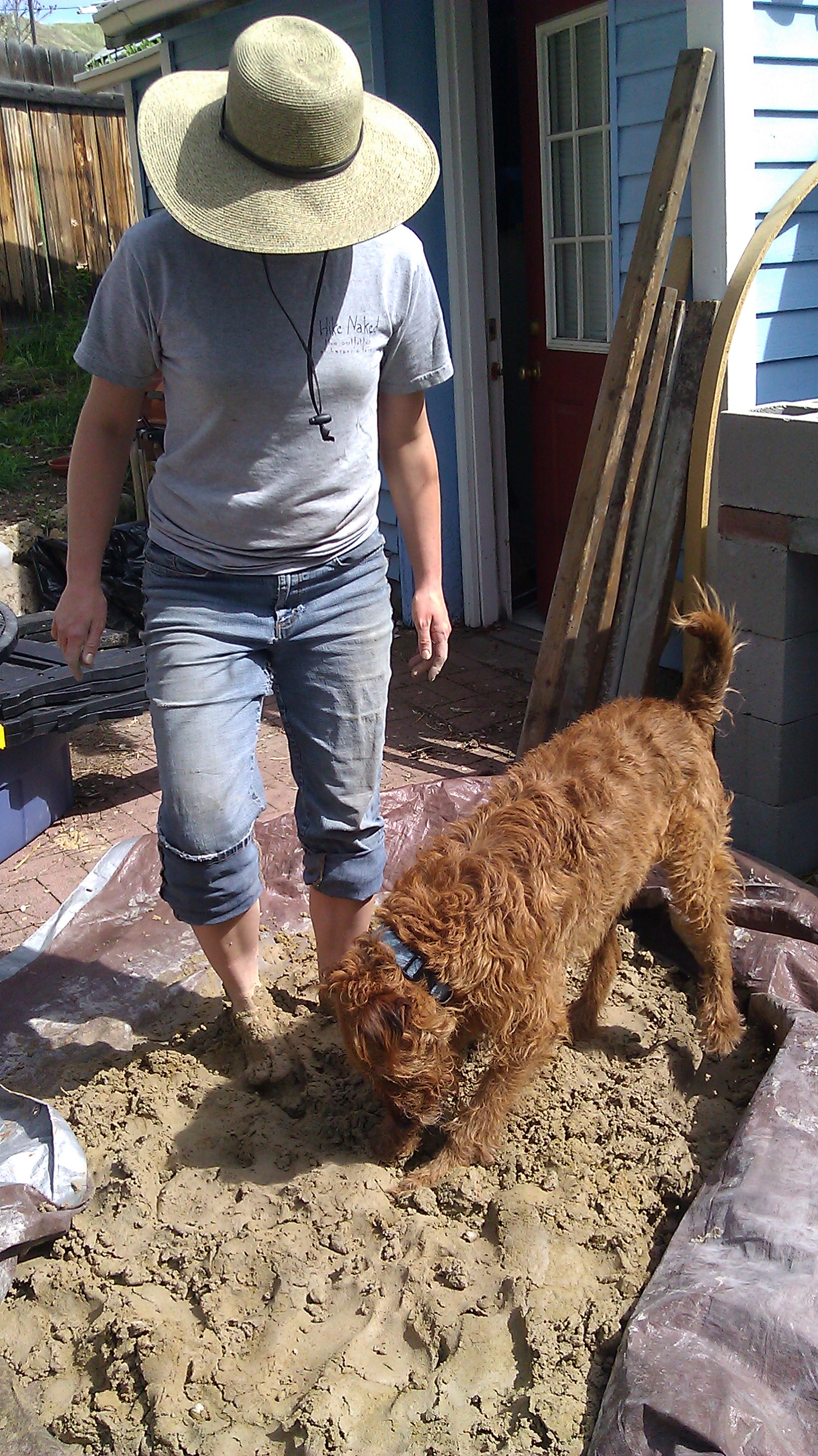 We started building the oven in the Spring, as soon as it was warm enough to comfortably work outside with wet sand and clay. We started by forming a sand mold for the inside of our oven as our fingers went numb. Once that set, we mixed “oven mud”. It turns out that mixing 30 lbs of clay, 120 lbs of sand and water is quite the task. We didn’t have a cement mixer which would have made the process much easier, so instead, we put down a tarp, poured on the materials, took off our shoes and jumped in. Jamie, our dog, even decided to help by digging. The cool gray mud oozed between our toes and feet grew heavy. After about 20 tiring minutes of dancing, digging, folding and jumping, we were exhausted and the oven mud was ready. We scooped the thick mud onto the sand mold to create the main walls for the oven.