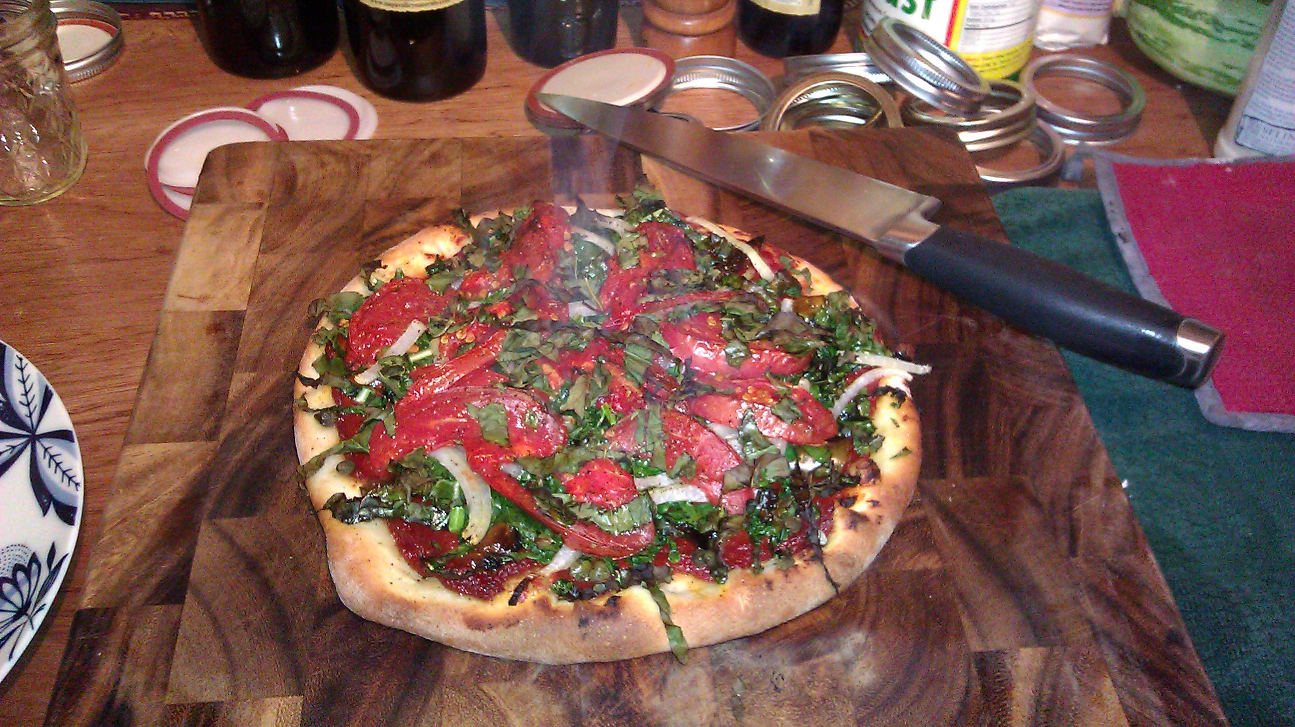 The following weekend, the clay was dry so we dug into the cold sand to remove the mold. Our oven was now a small dirt igloo. We should have added an layer of insulation but we were too anxious and excited about our first firing to wait. We read that when cooking with an earth oven, the objective is to use residual heat stored in the walls and floor to cook food rather than direct fire. This should provide a more even heat. With that in mind, we built a fire and let the oven warm. At the same time we grabbed tomatoes and basil from the garden; rolled out the dough; and piled on the toppings. After an hour of heating, I touched the outside of the oven and my hand jumped away from the scalding clay surface. We scraped out the glowing coals and put in the pizzas.