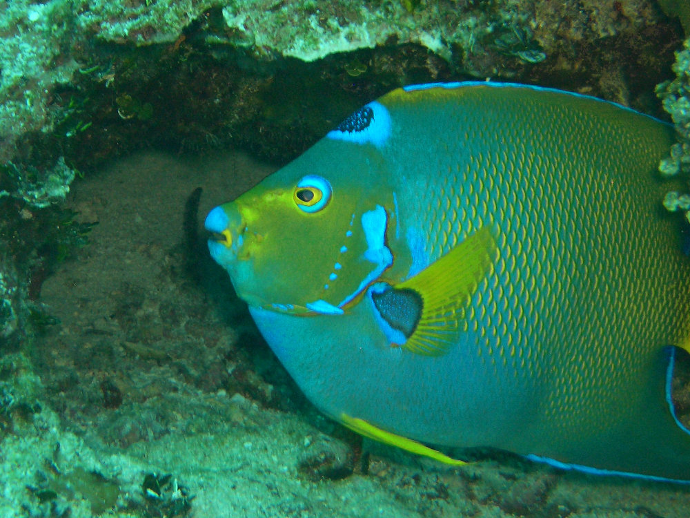 The last day of diving on this trip had only two dives. A storm was moving in so the seas were getting kicked up and the wind was blowing enough to make the 65° air feel cold (it’s amazing how fast you acclimatize to warmer temperatures). Getting in the water didn’t help, it also felt cold, but there was enough stuff to look at on the first dive to distract from the chill. There were two lobsters that were happily waving their antennae around. I assumed it was a defensive measure, but they were doing it when there didn’t seem to be anything to defend against. Perhaps they were both nervous about finding themselves trying to hide under rocks that were clearly too small. Under a much larger rock, not too far away, a large crab was hanging out with plenty of room to conceal itself. The highlight of the dive, however, was the queen angelfish at the cleaning station. The iridescent blue of these fish almost forces me to take pictures of them, but the photos never turn out as vibrant as they appear on the reef.
