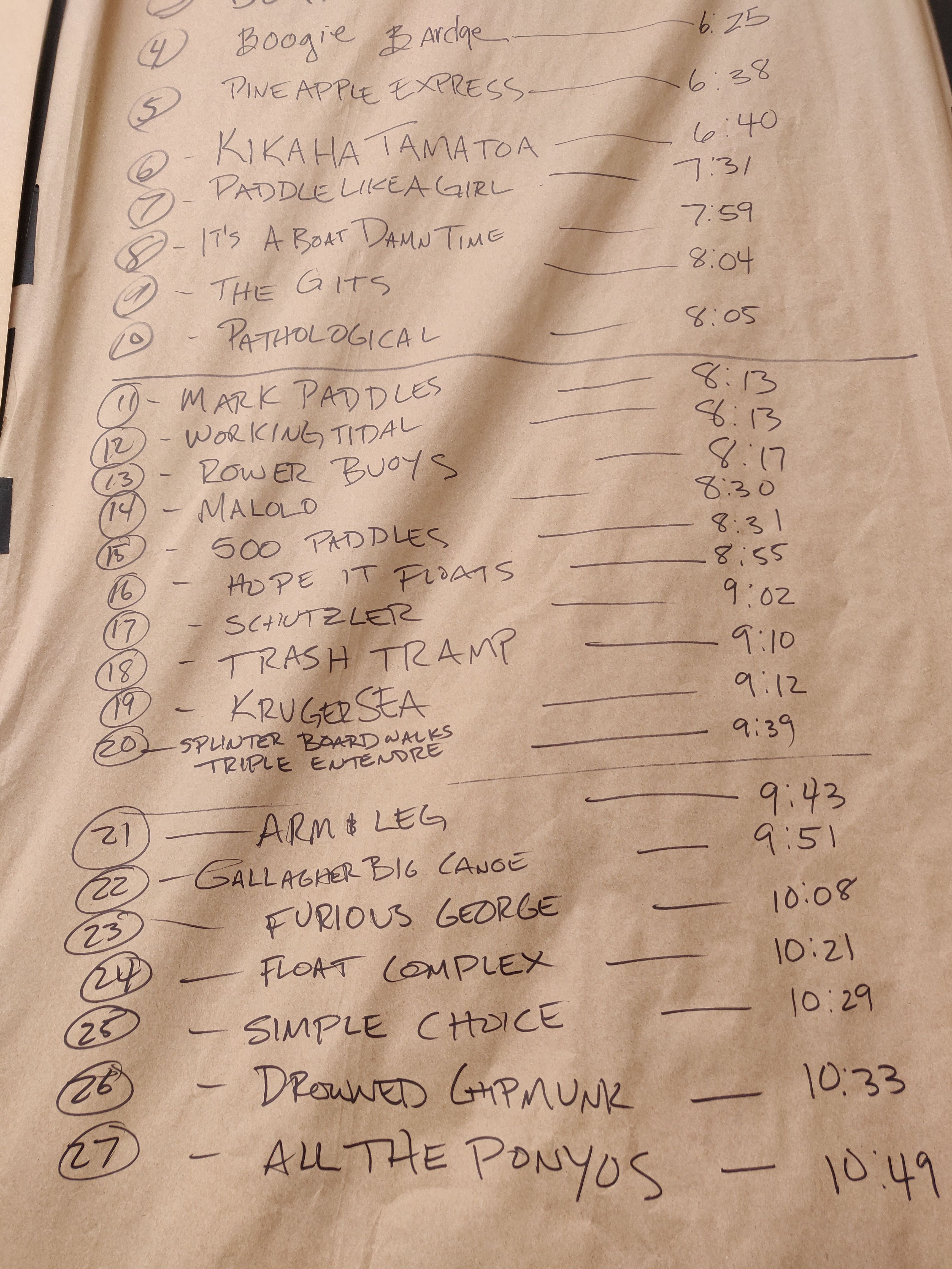 Getting to the launch site, I was greeted by so many different types of boats. I expected kayaks, rowing shells, and SUPs. I hadn’t thought about it much but wasn’t surprised to see outriggers or canoes. The catamaran-style boat with two 8-person canoes lashed together was unexpected, as was the 12-person canoe, and the four-person bike-boat. It was amazing to see the diversity of vessels attempting the event, some costing $10k+ and precisely engineering for speed while others appeared to be fun DIY projects that the owners were simply hoping would float long enough to complete the journey.
