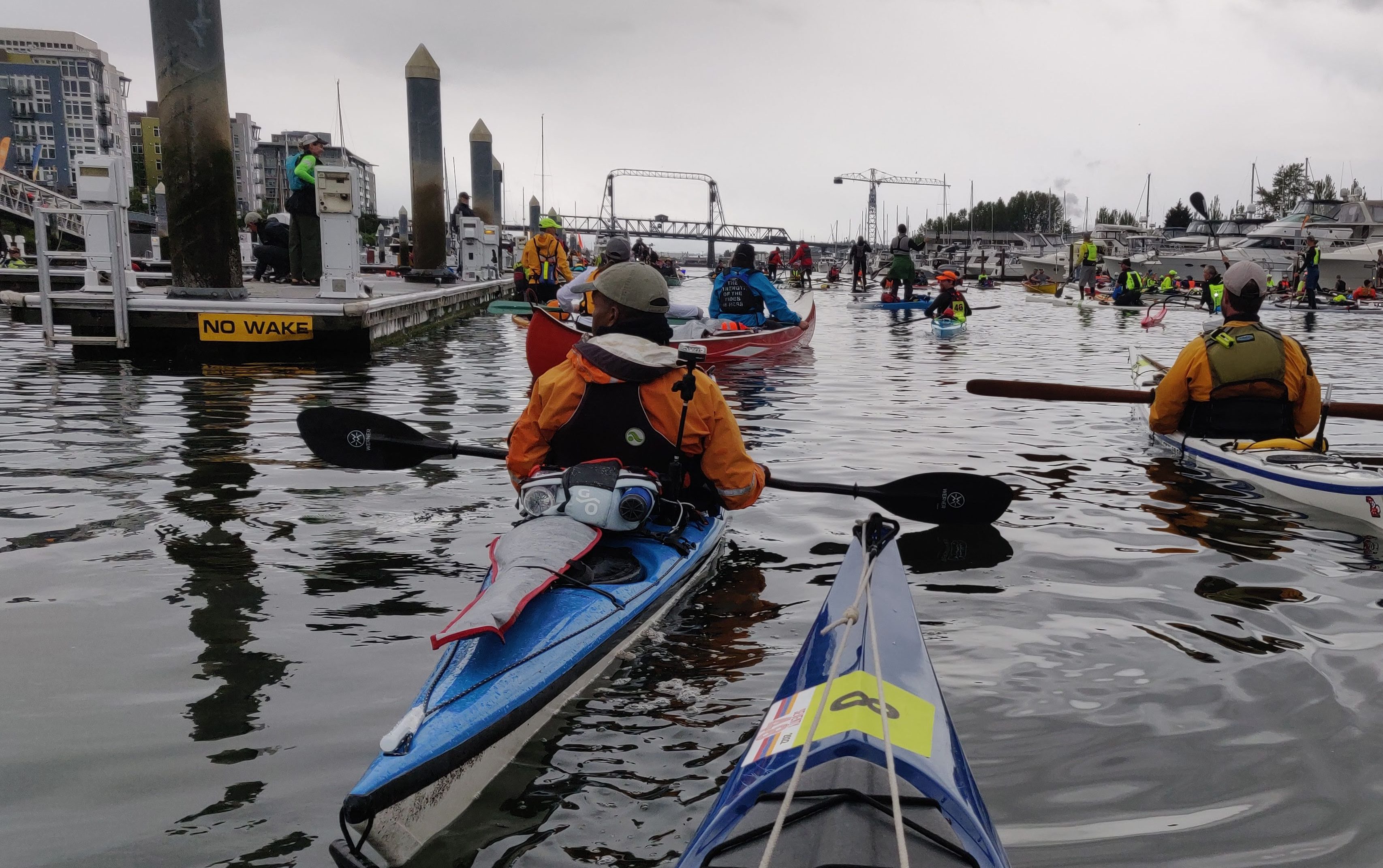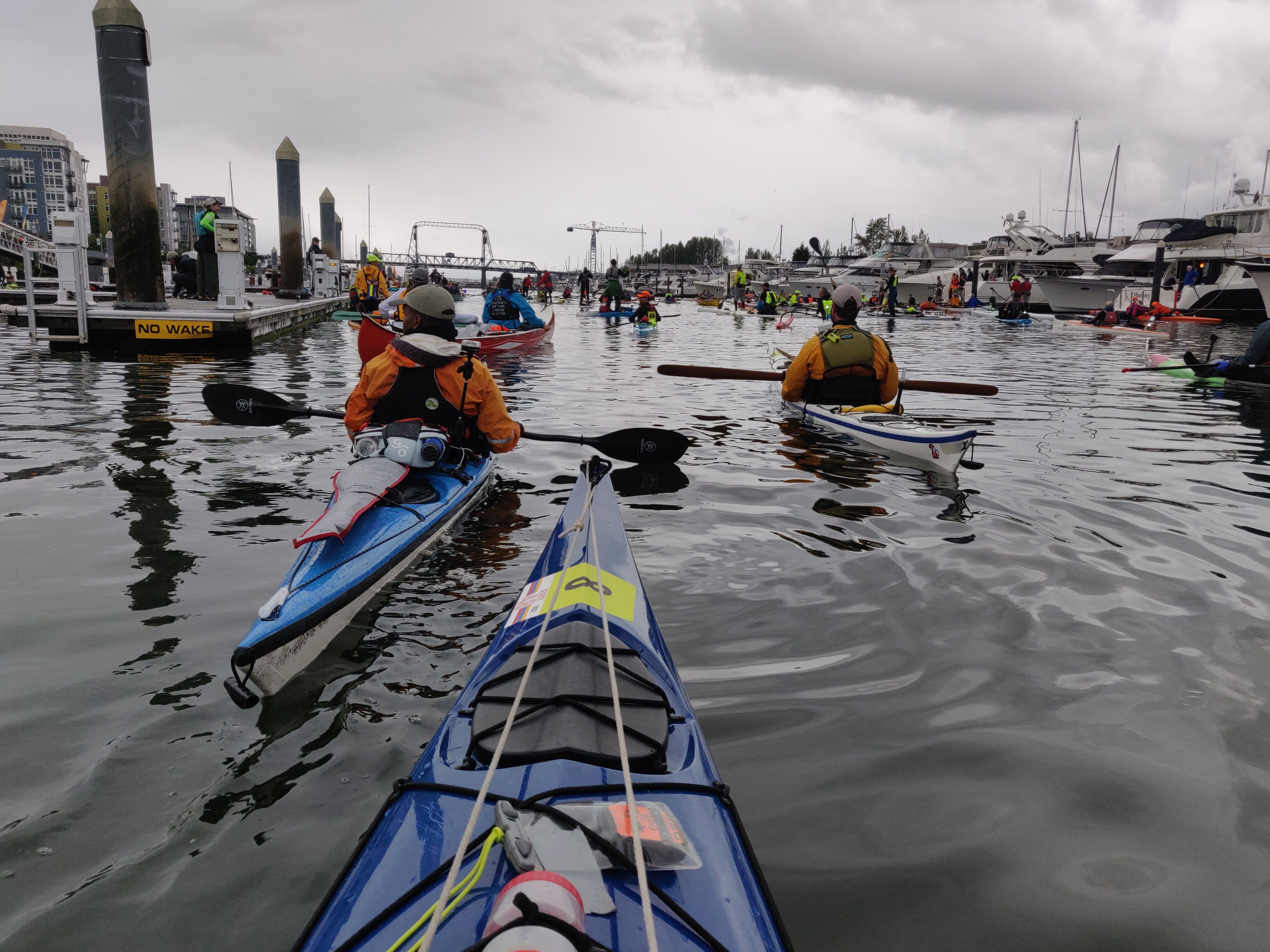 When the horn sounded, we headed out through Tacoma. People cheered us on from shore, bridges, and boats. Weirdly none of them seemed interested in trading places with me. After a mile or so, the crowd of boats started to spread out. I had plenty of room to paddle without worrying about hitting other boats while being close enough that we could still have conversations. As we continued along Ruston Way, a storm was moving in. Kayakers could see it coming while rowers had views of sunny skies behind us. At Point Defiance, we had a Spot Tracker GPS check where I found out my tracker had shut down. After restarting it, I turned the corner to head towards Vashon and almost immediately spotted a pod of porpoise. I was excited and pointed them out to another boat. “Oh yeah, Harbor Porpoise. They’re all over.” After spotting the third pod within the hour, I was a little less excited about seeing them… but only a little. This is also where the Humpback decided to check in on us.